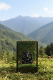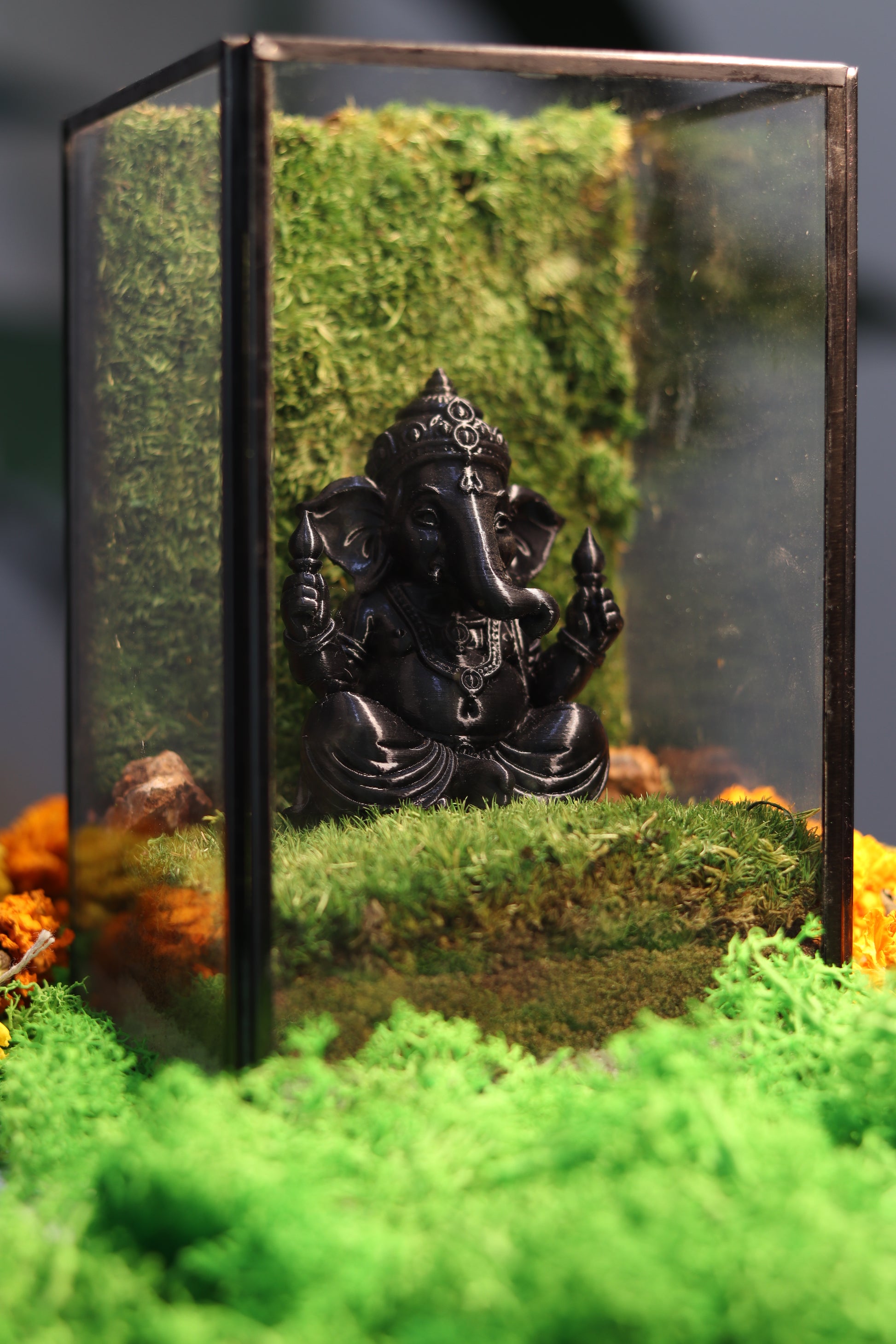 Evergreen Ganesha terrarium in real preserved moss, crafted for a modern spiritual touch.