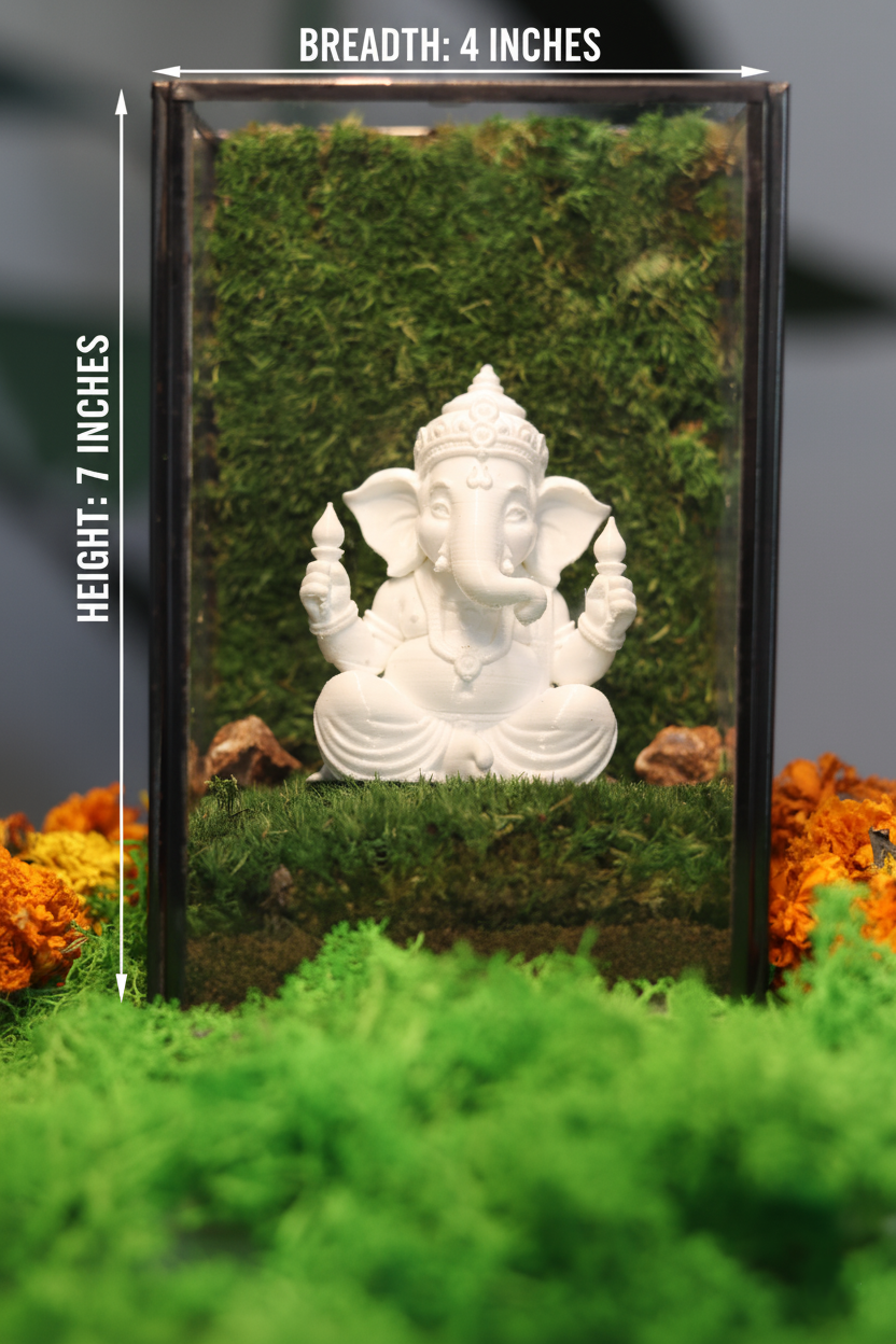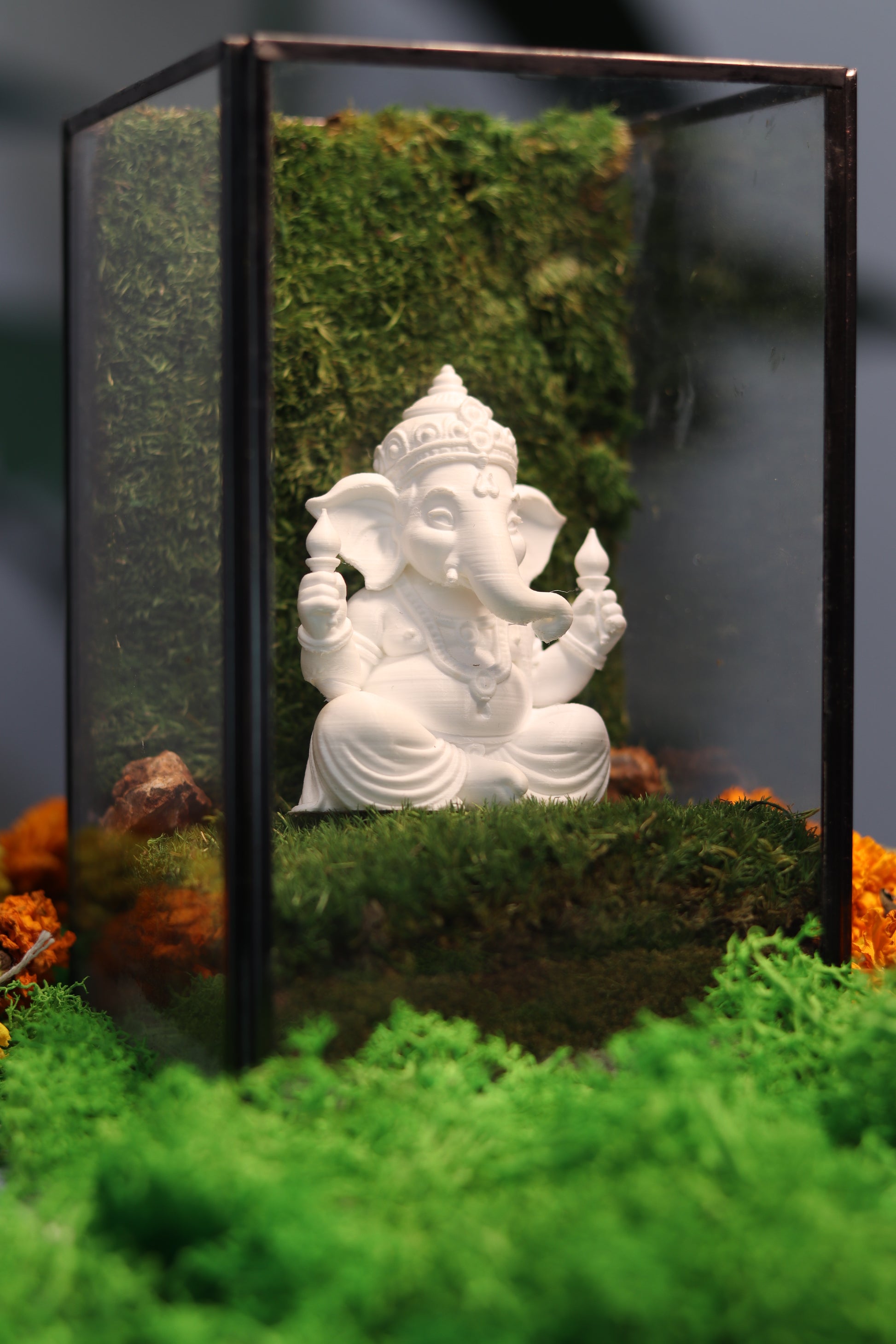 Evergreen Ganesha terrarium in real preserved moss, crafted for a modern spiritual touch.